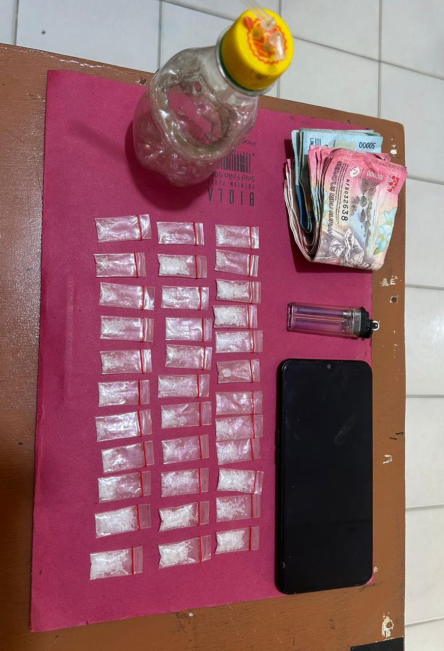 Lalu Polisi yang di dampingi ketua RT melakukan penggeledahan di sekitar tempat Pelaku diamankan dan ditemukan 34 paket di duga narkotika jenis sabu sabu, 1 set bong dan 1 unit hand phone Oppo warna Hitam, 1 buah mancis, uang tunai Rp 1.050.000 (satu juta lima puluh ribu rupiah) dan barang barang tersebut di temukan di tempat duduk para pelaku di dalam perkebunan kelapa sawit di Desa Aliantan