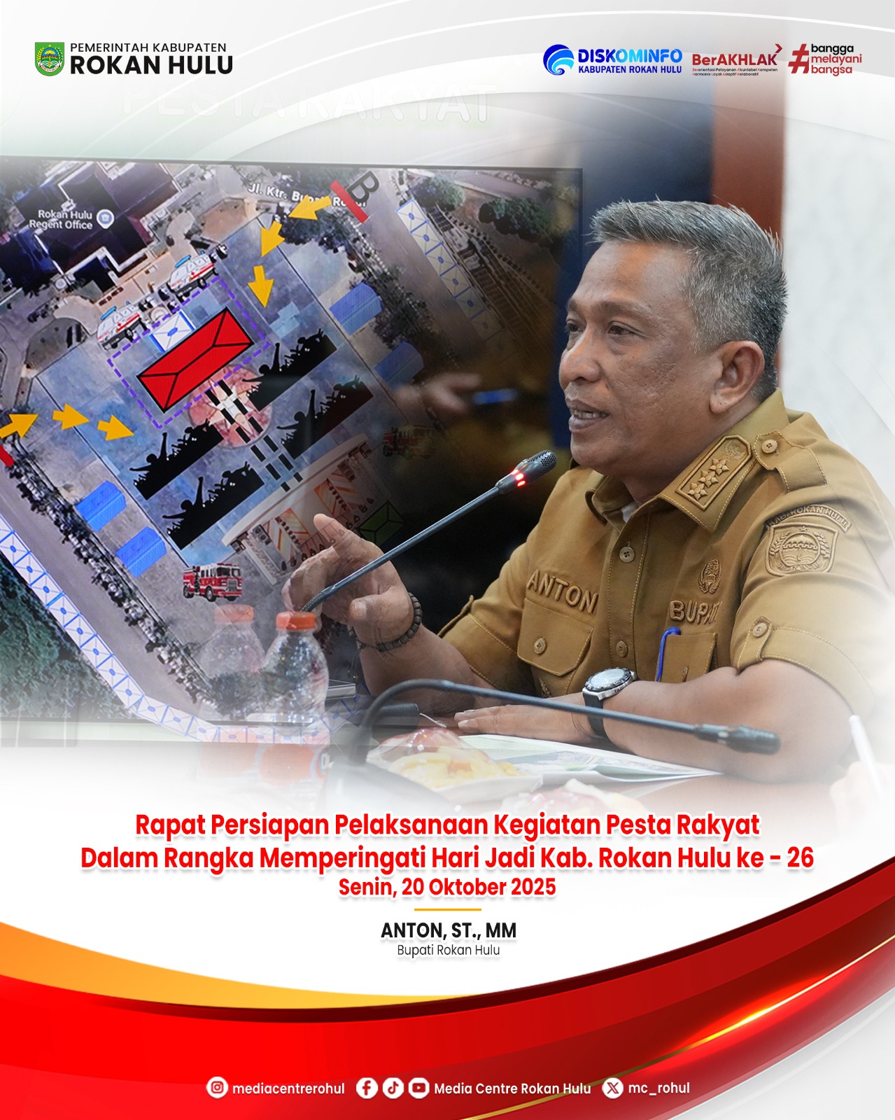 Menjelang pelaksanaan malam puncak pesta rakyat dalam rangka Hari Jadi Kabupaten Rokan Hulu (Rohul) ke-26 tahun yang berlangsung pada tanggal 25 nanti, Bupati Rohul Anton, ST, MM memimpin rapat finalisasi persiapan di Ruang rapat Rumah Dinas Bupati, Senin (20/10/2025).