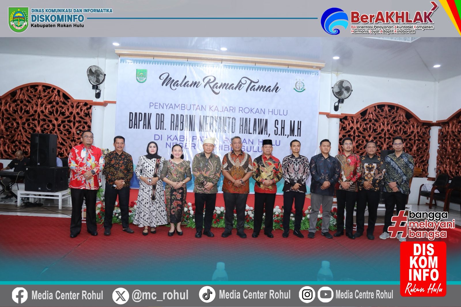 Bupati Kabupaten Rokan Hulu (Rohul) Anton, ST, MM menyambut kedatangan Kepala Kejaksaan Negeri (Kajari) Rohul yang baru, Dr. Rabani Meryanto Halawa, SH, MH, dengan penuh kehangatan dalam acara Malam Ramah Tamah di Rumah Dinas Bupati, Jumat (15/8/2025).