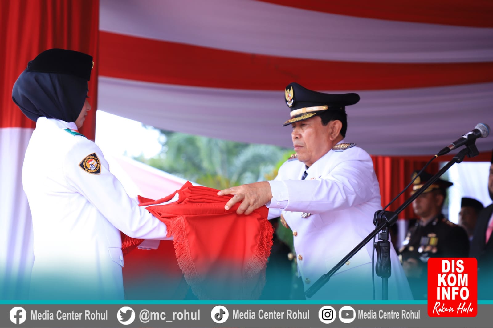 Sementara Petugas Pengibaran Bendera Sang Merah Putih, Danki Pasukan Letda Inf Sutrisno Jabatan Danton SMS Kompi Bantuan Yonif 132 Bima Sakti, Dan Pasukan 8 Petugas Pembawa Baki Pengibaran penjemput Bendera Delmiati Siswa SMAN 1 Ujung Batu, Putri dari Ayah Alm.Uwan dan Ibu Eti, Pengibar Bendera Penarik Tali Muhammad Daffa Budiman Siswa SMAN 1 Rambah Hilir, Putra dari Ayah Husni Budiman, Ibu Akyuni, Pembentang Bendera Faisal Ramadhani Siswa Ponpes Basma Putra dari ayah Suryadi Ibu Nurbaiti, Pemberi Aba aba Reno Cahyadi Siswa SMA N 1 Ujung Batu, Putra dari ayah Diki Setiadi ibu Ningsih Asih, Pengapit Kanan Pengamil Bendera Aldo Akma Anggota Polri dan Pengapit Kiri Pengambil Bendera Imanuddin Maulana Lubis Anggota Polri.