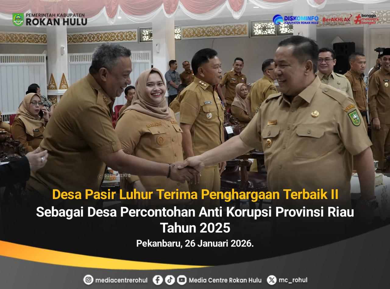 Suasana haru dan bangga menyelimuti Aula Balai Pauh Janggi, Pekanbaru, Senin (26/1/2026). Bupati Rokan Hulu, Anton, ST, MM, menyaksikan langsung momen bersejarah saat salah satu desa di wilayahnya, Desa Pasir Luhur, dinobatkan sebagai Desa Percontohan Anti Korupsi Provinsi Riau Tahun 2025.