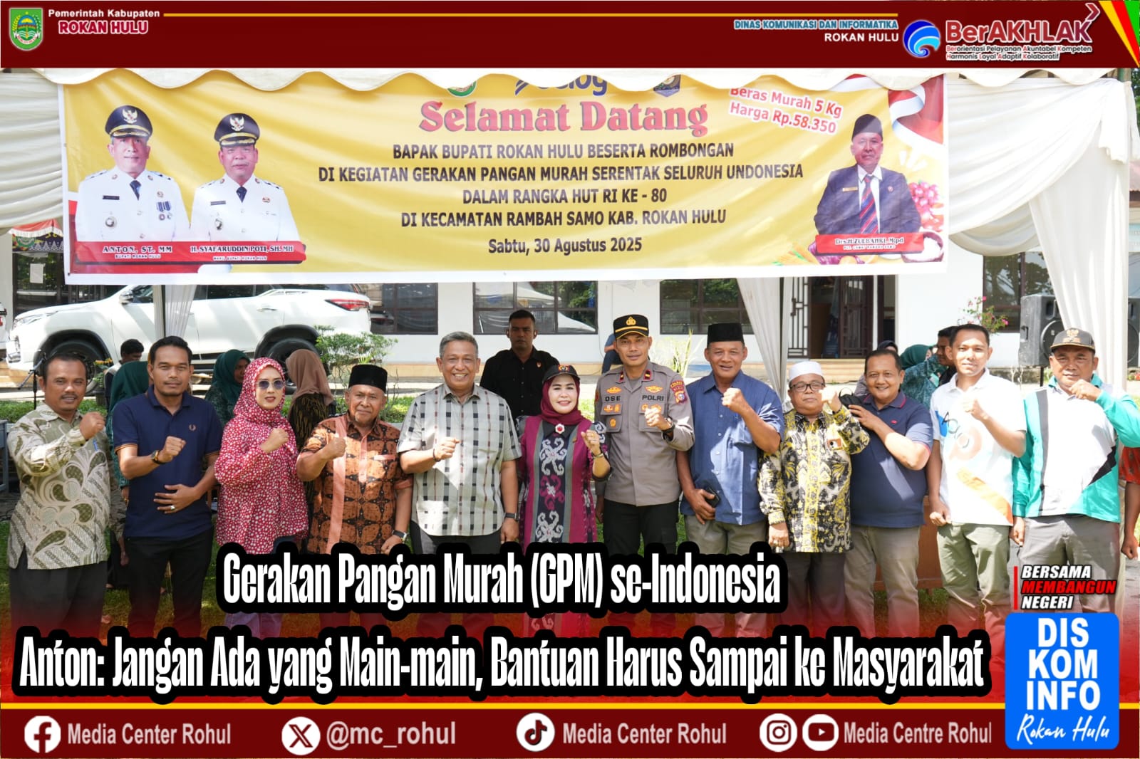 Bupati Rokan Hulu, Anton, ST., MM menghadiri kegiatan Gerakan Pangan Murah (GPM) serentak se-Indonesia secara virtual di Halaman Kantor Camat Rambah Samo, Sabtu (30/8/2025).