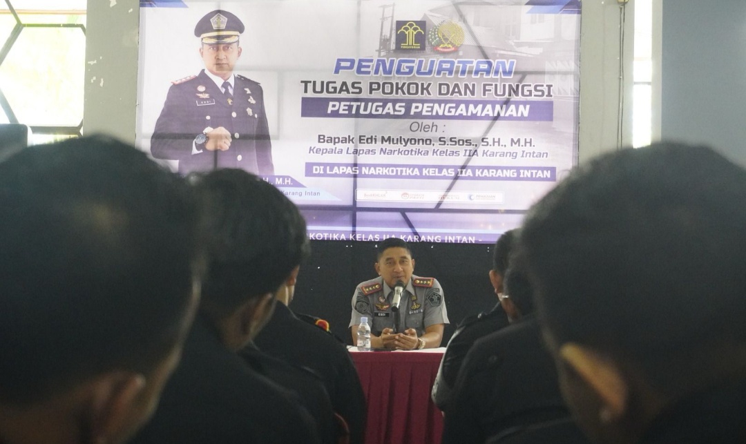 Petugas Regu Pengamanan Lembaga Pemasyarakatan (Lapas) Narkotika Kelas IIA Karang Intan, terima penguatan tugas dan fungsi (tusi) Pemasyarakatan yang disampaikan Kepala Lapas (Kalapas), Edi Mulyono, Selasa (15/10/2024).