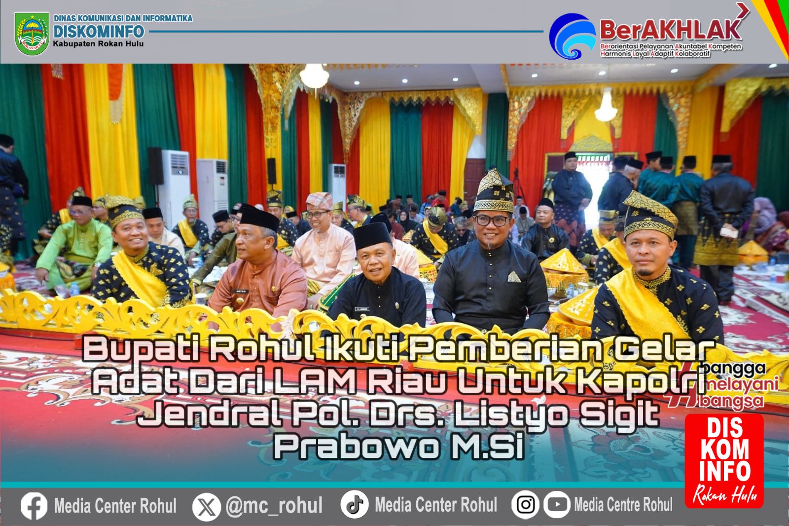 Bupati Rokan Hulu (Rohul), Anton, ST, MM, menghadiri langsung kegiatan Penganugerahan Adat Ingatan Budi kepada Kepala Kepolisian Republik Indonesia (Kapolri), Jenderal Pol. Drs. Listyo Sigit Prabowo, M.Si, yang digelar di Kantor Lembaga Adat Melayu (LAM) Provinsi Riau, Sabtu (12/7/2025).