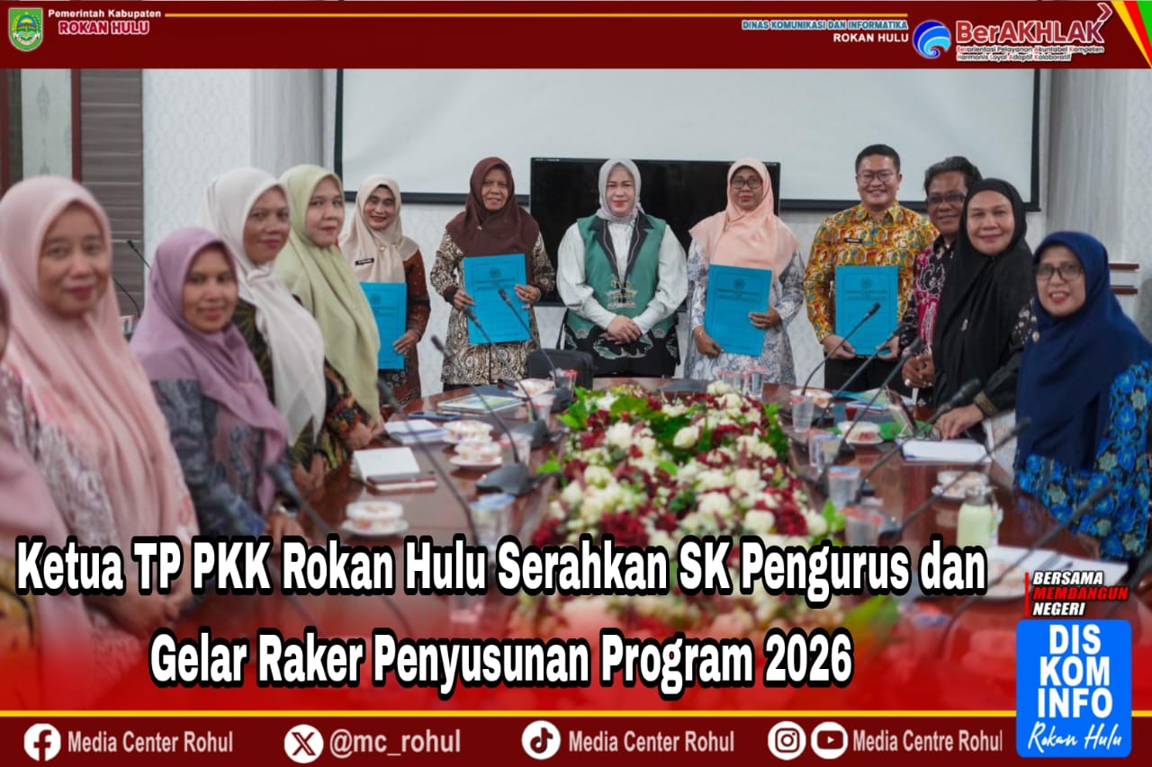 Tim Penggerak Pemberdayaan Kesejahteraan Keluarga (TP PKK) Kabupaten Rokan Hulu (Rohul) melaksanakan kegiatan penting berupa penyerahan Surat Keputusan (SK) Pengurus dan dilanjutkan dengan Rapat Kerja (Raker) penyusunan program kerja untuk tahun 2026.
