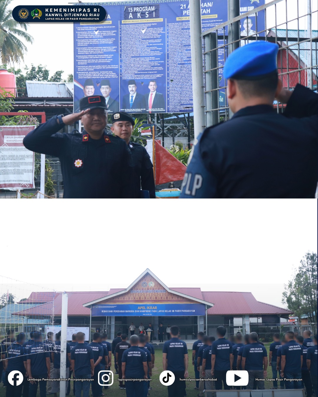 Lembaga Pemasyarakatan (Lapas) Kelas IIB Pasir Pangarayan menggelar kegiatan apel dan pembacaan ikrar komitmen bersama bebas dari peredaran narkoba dan handphone, Senin (20/4/2026), di Lapangan Lapas Pasir Pangarayan.