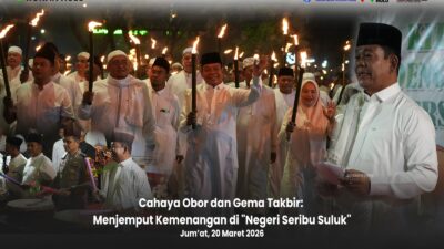 Suasana malam takbiran Idul Fitri 1447 H di Kabupaten Rokan Hulu berlangsung meriah dan penuh khidmat dengan digelarnya pawai obor yang diikuti sekitar 1.800 peserta, Jumat malam (20/3/2026).
