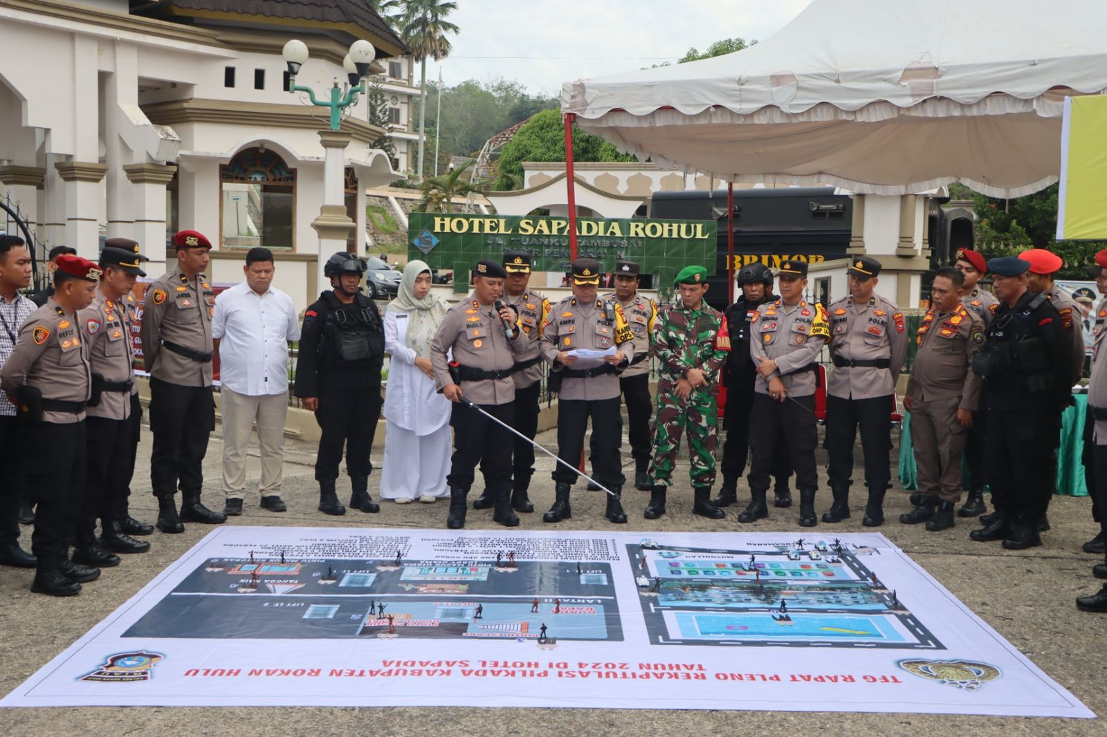 Operasi Mantap Praja Lancang Kuning 2024 (OMP-LK24) Apel Pengamanan Rapat Pleno Terbuka Rekapitulasi Perolehan Suara Tingkat Kabupaten Rokan Hulu untuk Pemilihan Gubernur dan Wakil Gubernur serta Bupati dan Wakil Bupati Tahun 2024, pada hari Selasa, (03/11/2024), pukul 07.00 WIB. Kegiatan ini berlangsung di Lantai II Hotel Sapadia, Pasir Pangaraian, Kecamatan Rambah.