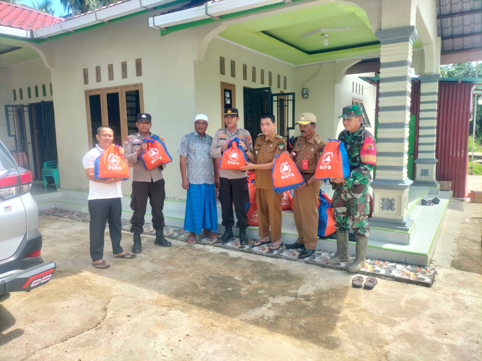 Terpantau Kanit Binmas Ipda B Lumban Gaol mendampingi Camat Tambusai M. Khadafi S Sos memberikan bantuan Sembako pada Masyarakat yang terdampak Luapan Air Sungai Batang Sosa.