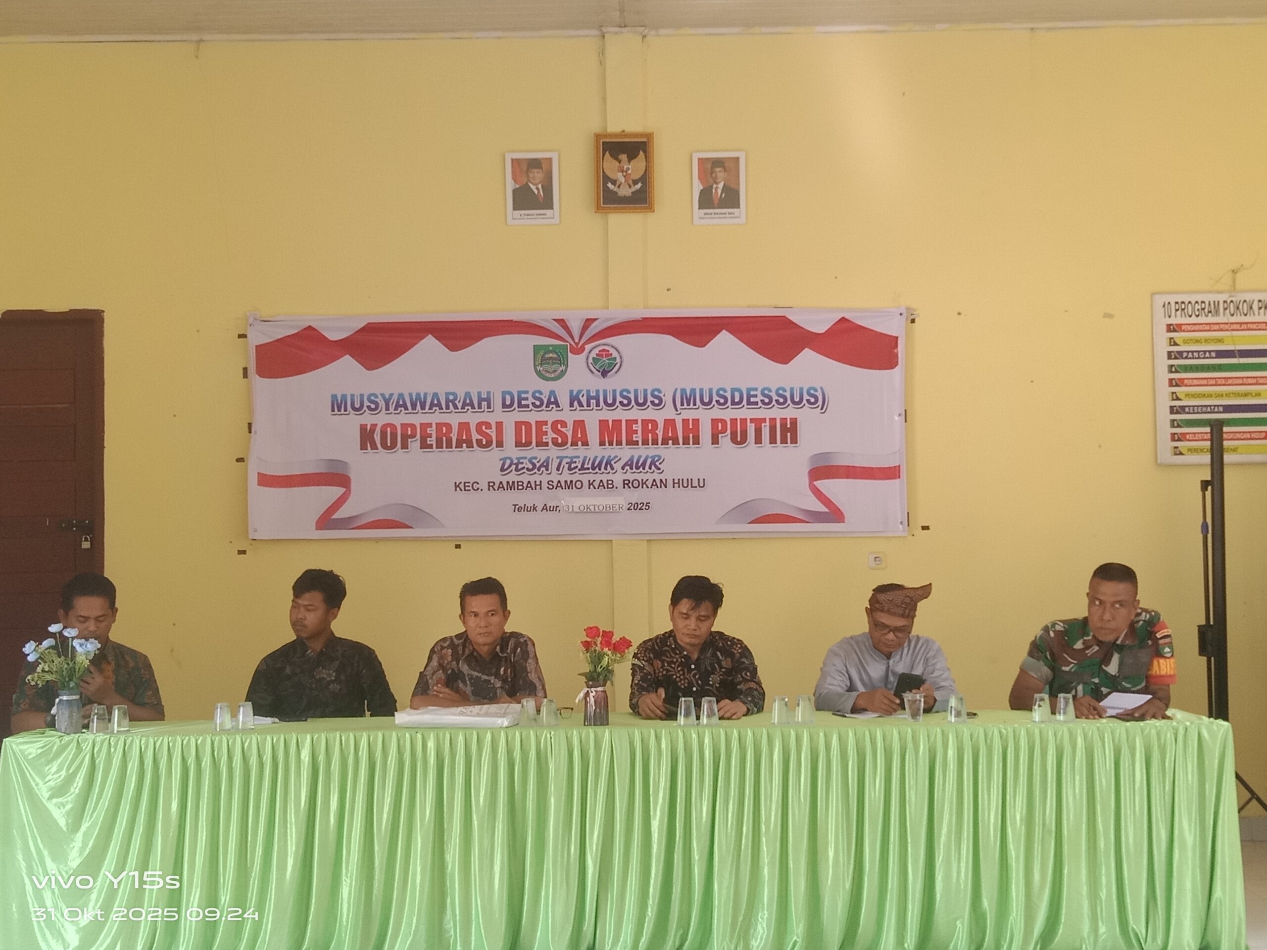 Pemeritah Desa Teluk Aur melaksanakan Musyawarah Desa Khusus Koperasi Desa Merah Putih bertempat diruang Aula Desa Teluk Aur, Kecamatan Rambah Samo, Kabupaten Rokan Hulu, Provinsi Riau. Jum’at (31/10/2025).