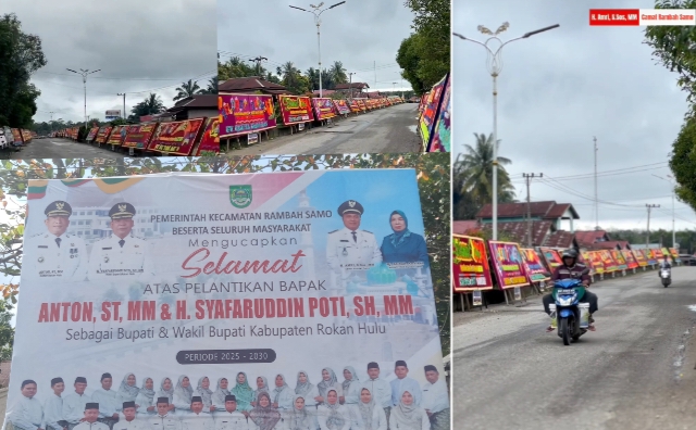Dalam situasi pelantikan bupati dan wakil Bupati Rohul yang di laksanakan di jakarta, pemerintah kecamatan Rambah Samo beserta seluruh instansi terkait gelar kegiatan memasang spanduk papan bunga atau baleho di pinggir jalan di lingkungan kantor camat rambah Samo kabupaten Rokan hulu,provinsi Riau.