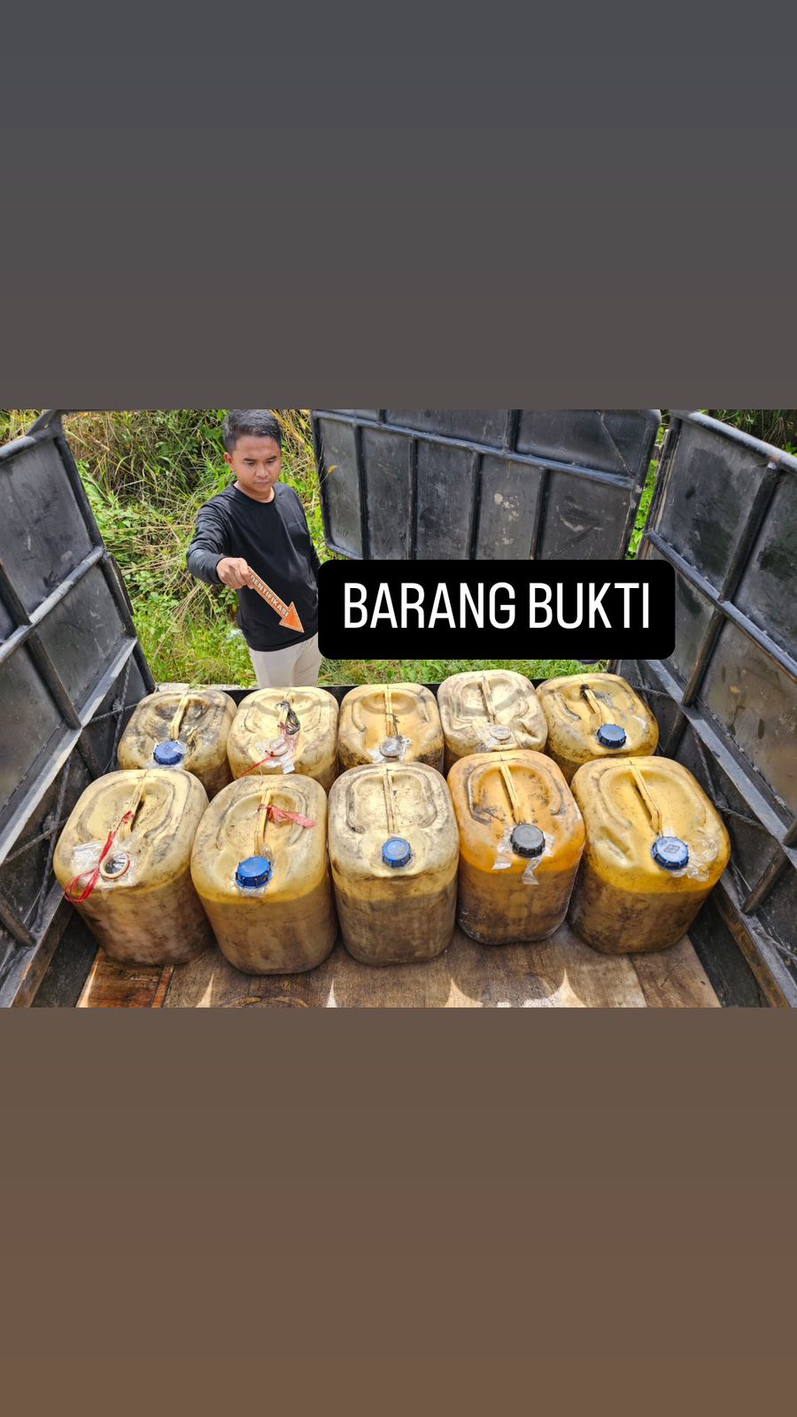 Dari hasil pemeriksaan di tempat, tim menemukan barang bukti berupa 2 (Dua) jerigen berisi BBM jenis Pertalite, 10 (Sepuluh) jerigen berisi BBM jenis Bio Solar, 34 (Tiga puluh empat) jerigen kosong, Uang tunai senilai Rp8.400.000,- hasil penjualan BBM, 1 (Satu) selang sepanjang satu meter, 4 (Empat) corong plastik dan 1 (Satu) buku catatan penjualan BBM berikut sebuah pena.