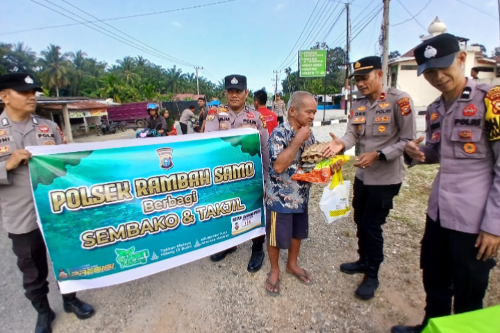 Dalam rangka meningkatkan kepedulian sosial di bulan suci Ramadan, jajaran Polsek Rambah Samo menggelar kegiatan berbagi takjil dan sembako kepada masyarakat. Kegiatan tersebut dilaksanakan di depan Mapolsek Rambah Samo, Kamis (12/3/2026).