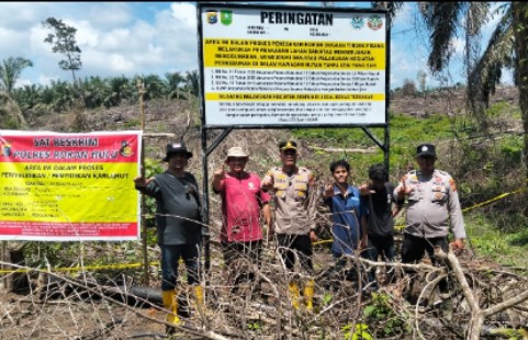 Plang tersebut berisi tulisan peringatan bahwa “Area ini dalam proses penegakan hukum dugaan tindak pidana melakukan pembakaran lahan dan atau mengerjakan, menggunakan, menduduki dan/atau melakukan kegiatan perkebunan di dalam kawasan hutan tanpa izin yang sah, serta dilarang melakukan kegiatan apapun di area bekas terbakar.”