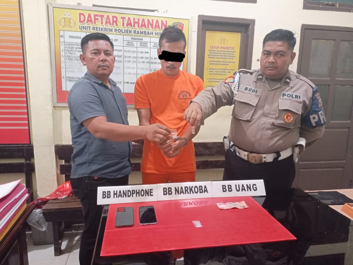 Kapolsek Rambah Hilir gagalkan Transaksi Narkotika dan amankan pelaku tindak pidana Memiliki, Menyimpan, Menguasai, membeli, menjual atau menjadi perantara dalam jual beli Narkotika Golongan I bukan tanaman. Jumat Sore, 23/05/2025 sekira pukul 16.30 WIB