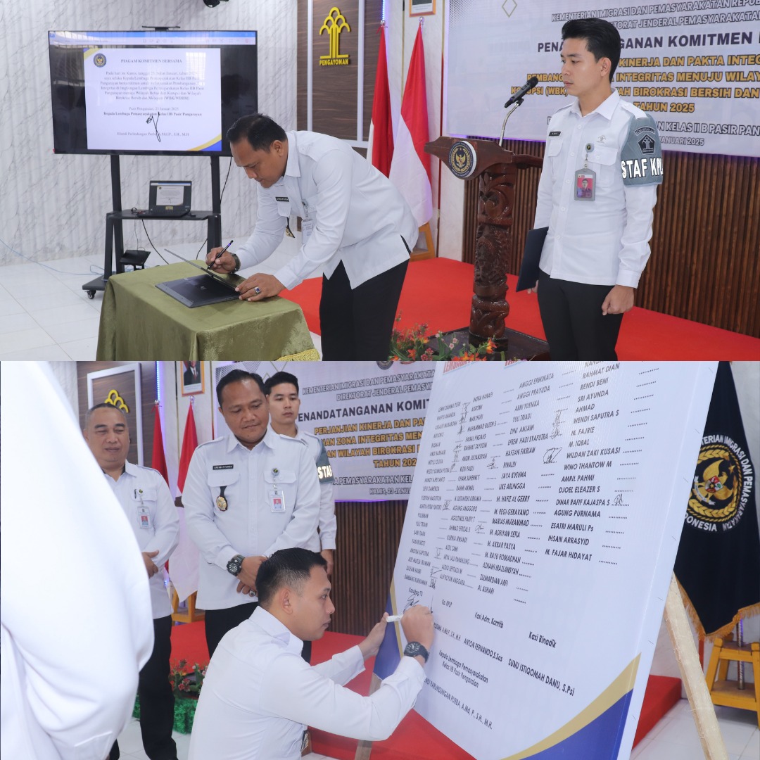 Pasir Pengaraian – Sebagai wujud komitmen dalam mewujudkan tata kelola pemerintahan yang akuntabel, Lapas Kelas IIB Pasir Pangarayan melaksanakan Apel Pencanangan zona integritas menuju wilayah bebas dari korupsi (Wbk) dan wilayah birokrasi bersih dan melayani (Wbbm). Kegiatan ini menindaklanjuti surat edaran Direktorat Jenderal Pemasyarakatan dan surat edaran Kantor Wilayah Direktorat Jenderal Pemasyarakatan Riau terkait pelaksanaan pencanangan pakta integritas dan perjanjian kinerja di lingkungan Unit Pelaksana Teknis Pemasyarakatan Tahun 2025 pada Kamis (23/01/2025).