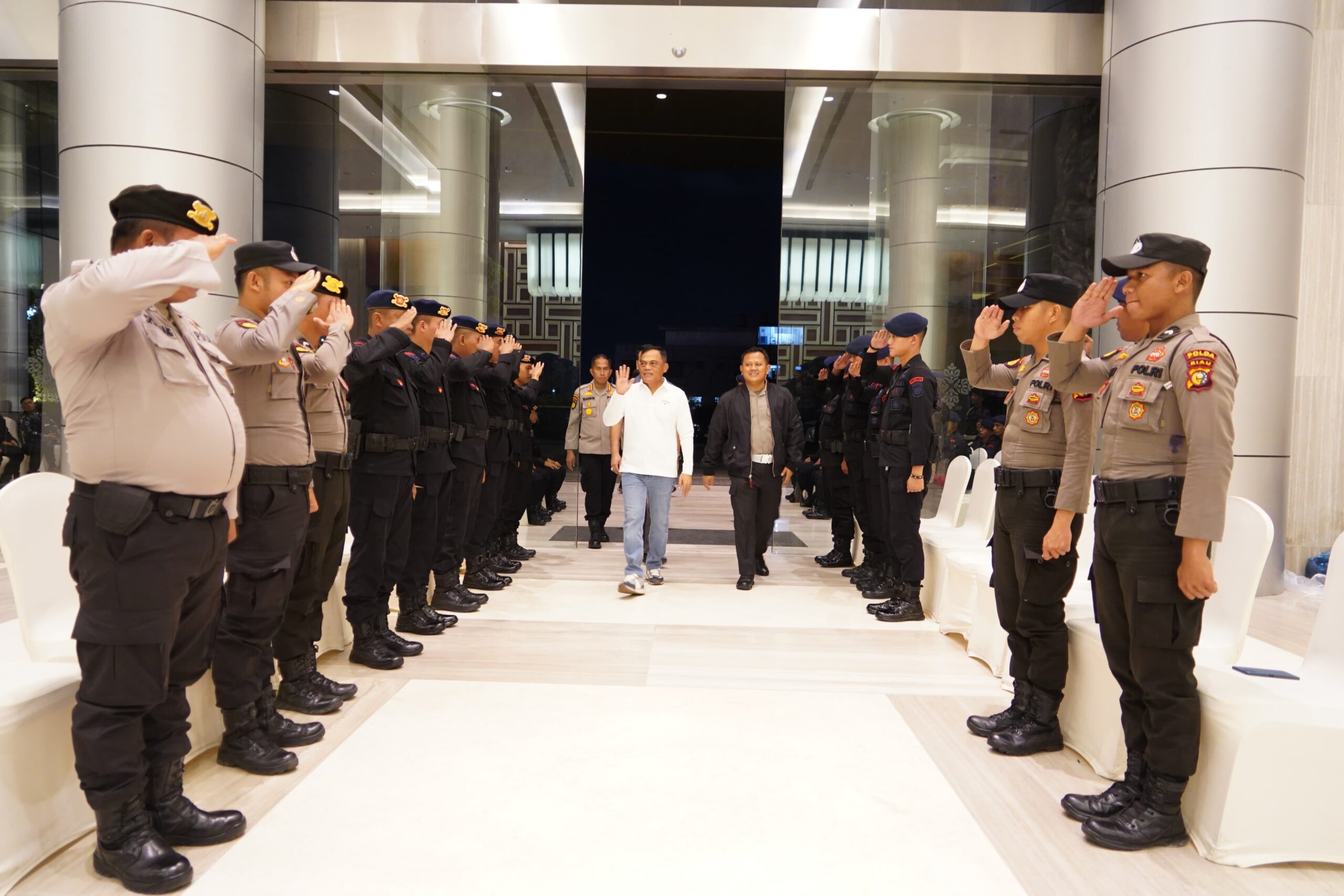 Kepolisian Daerah (Polda) Riau melaksanakan Apel Kesiapan Pengamanan Pelaksanaan Debat Publik Ke-2 Calon Gubernur/Wakil Gubernur Pilkada Riau Tahun 2024 bertempat di halaman Gedung SKA Co-Ex, Minggu (17/11/2024) sore.