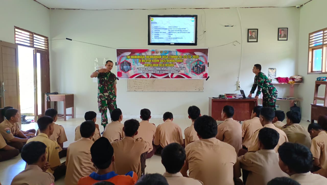 Dalam rangka membangun karakter generasi muda yang tangguh dan berwawasan kebangsaan, Kodim 0431/Bangka Barat menggelar penyuluhan Bela Negara dan Bahaya Narkoba bagi siswa-siswi SMK 1 Parittiga, dalam program TNI Manunggal Membangun Desa (TMMD) ke-123.