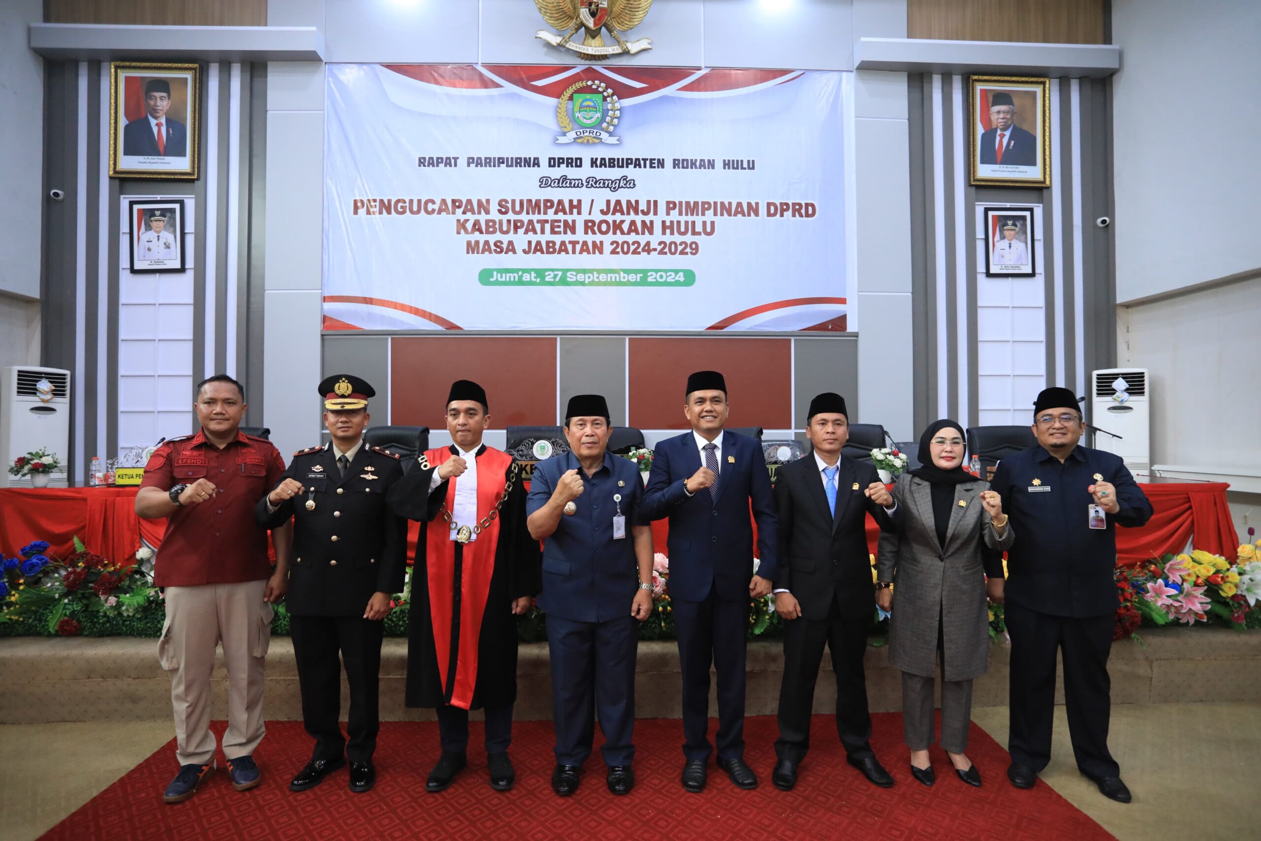 Dalam Ops Mantap Praja Lancang Kuning Tahun 2024 (OMP-LK24), Kapolres Rokan Hulu (Rohul) AKBP Budi Setiyono SIK MH melalui Wakapolres Rokan Hulu Kompol Rahmat Hidayat SIK menghadiri kegiatan Rapat Paripurna DPRD Rohul dalam pengucapan Sumpah/Janji Pimpinan DPRD Masa Jabatan 2024-2029.